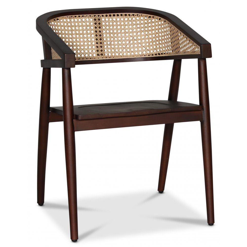 Karmstol med stomme av exklsuiv mahogny i brunt, ryggstöd av naturfärgad rotting. Brun träsits.