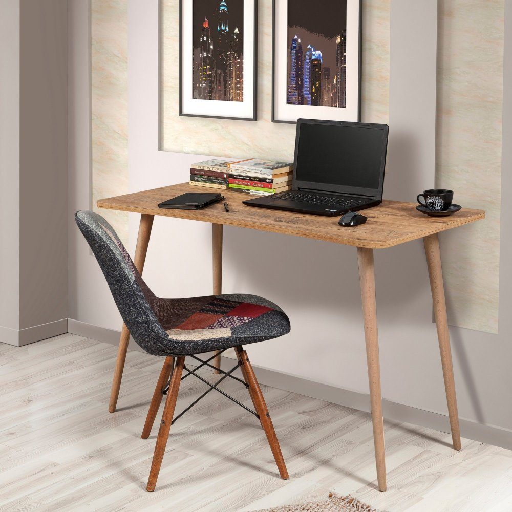Skrivbord av spånskiva med ben i massivt trä.