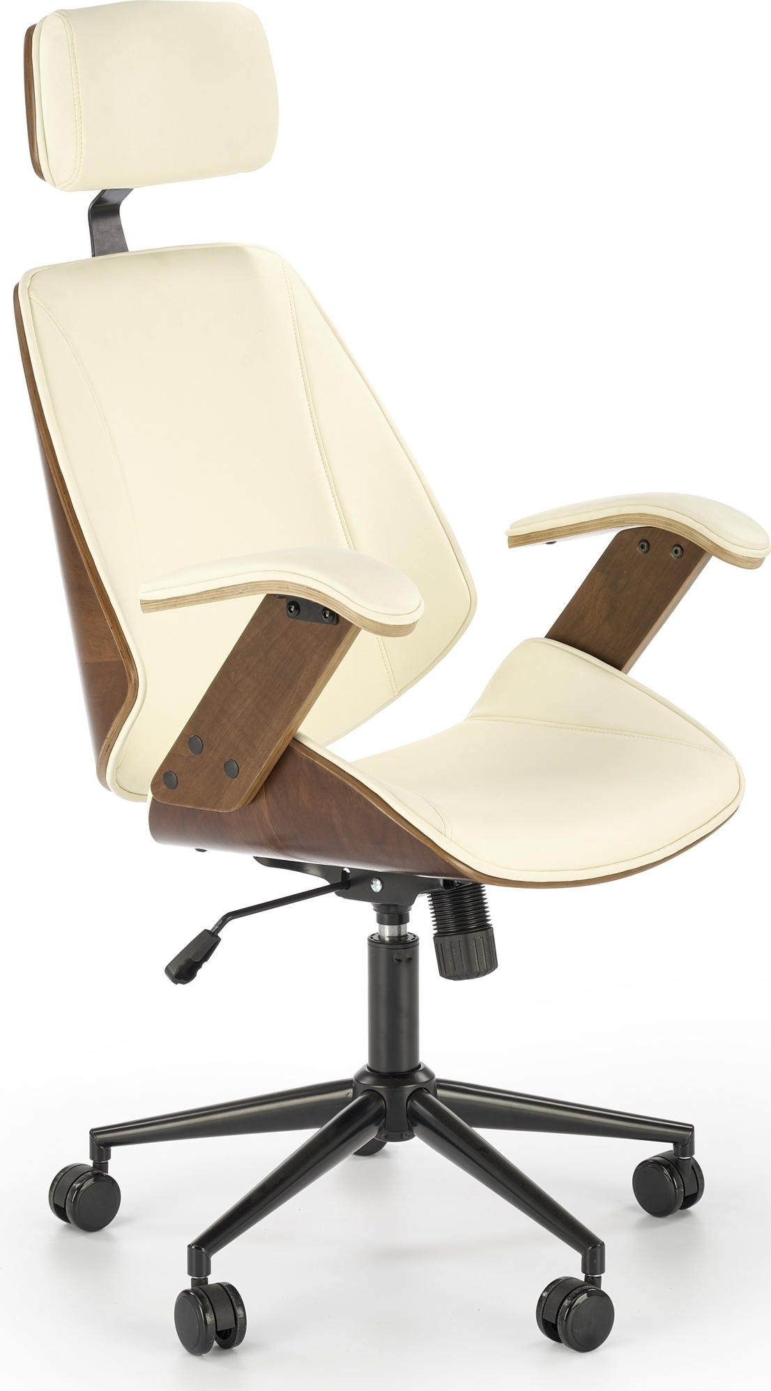 Kontorsstol av metall och plywood med klädsel av ekoläder.