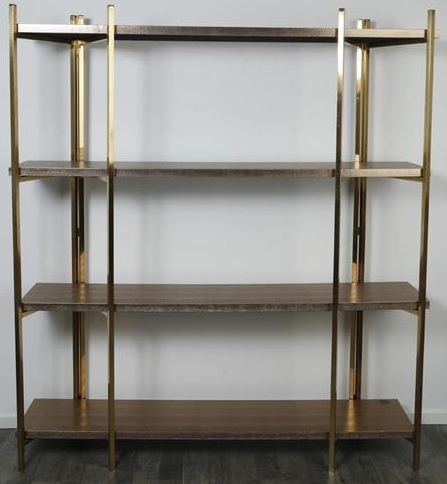 Stor och modern hylla med stomme i mässingsfärgad metall och hyllplanen klädda i brunt ormliknande konstläder.