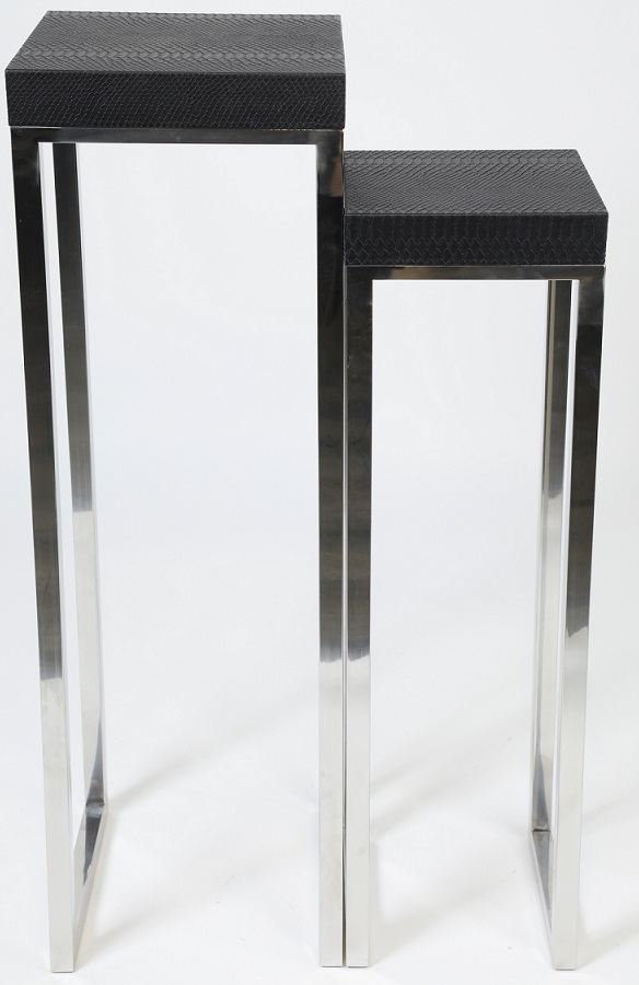 Snake piedestal med sitt häftiga utseende med toppskivor i svart ormliknande konstläder och underrede i krom.