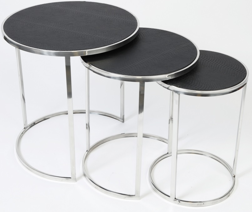 Snake runt satsbord med sitt häftiga utseende med sina toppskivor i svart ormliknande konstläder och underrede i krom.
