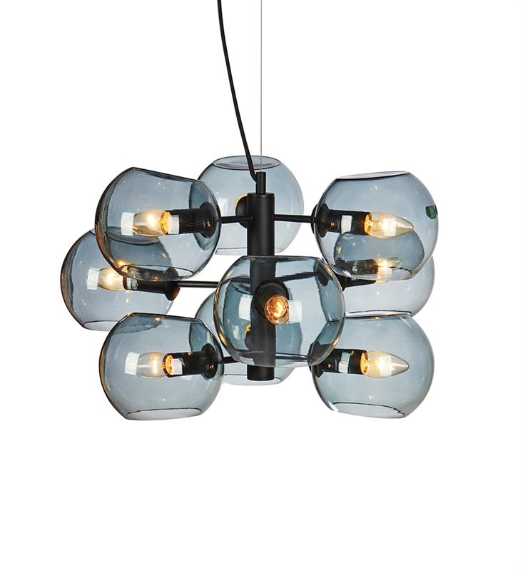 Taklampa Soap med en stilren design. Stommen är tillverkad i svart metall och kuporna av färgat glas. Monteras på takkrok. Jordad anslutning till kopplingsplint eller takkontakt. 9st små lamphållare (E14) för max 40W eller motsvarande i LED, halogen eller lågenergi. 1,5 meter textilklädd kabel. Lampan monteras lätt på plats och passar perfekt in på flera olika platser i hushållet.