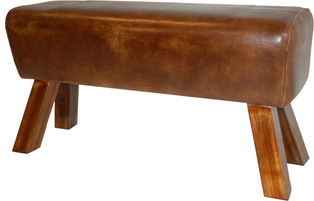 Bänk i fräck design av antikbehandlat brunt läder och mörka träben. En möbel som höjer mysfaktorn i hemmet.