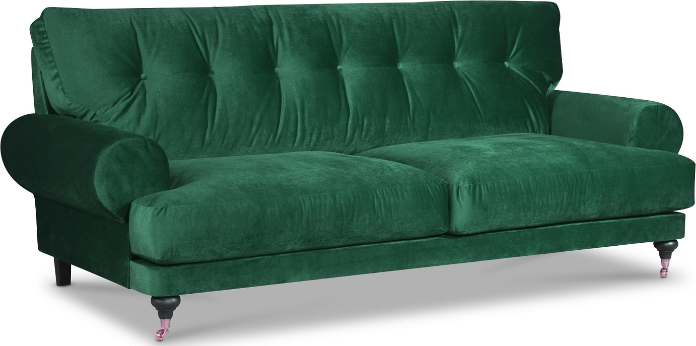 Snygg form. Valde i sammet, petrolfärg. Riktigt snygg soffa. Lite åt det hårdare hållet att sitta i, vilket jag föredrar. Hård pga innehåller mycket fyllning, inte pga att jag sitter direkt mot fjädrarna. Känns rejäl med hög kvalité.