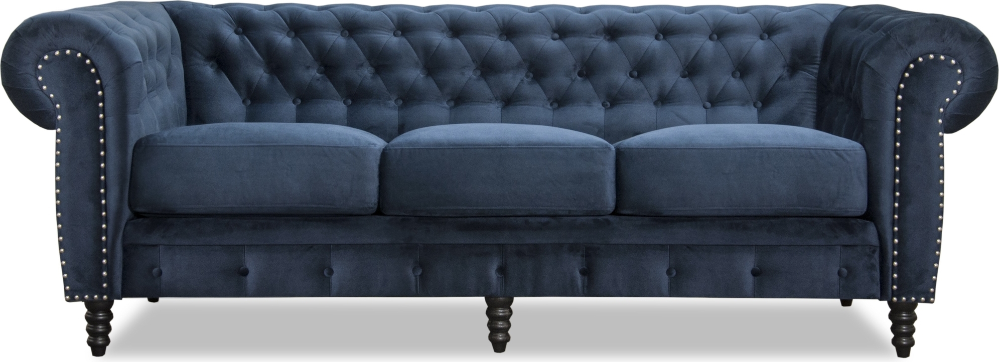 Ashford 3-sitssoffa i Chesterfield-stil är en möbel som utstrålar tidlös elegans och lyx, perfekt för vardagsrum. Klädd i djupblå sammet ger soffan ett sofistikerat intryck som kombinerar klassisk design med modern stil. De djuphäftade knapparna och de vackert rullade armstöden förstärker den ikoniska Chesterfield-looken.