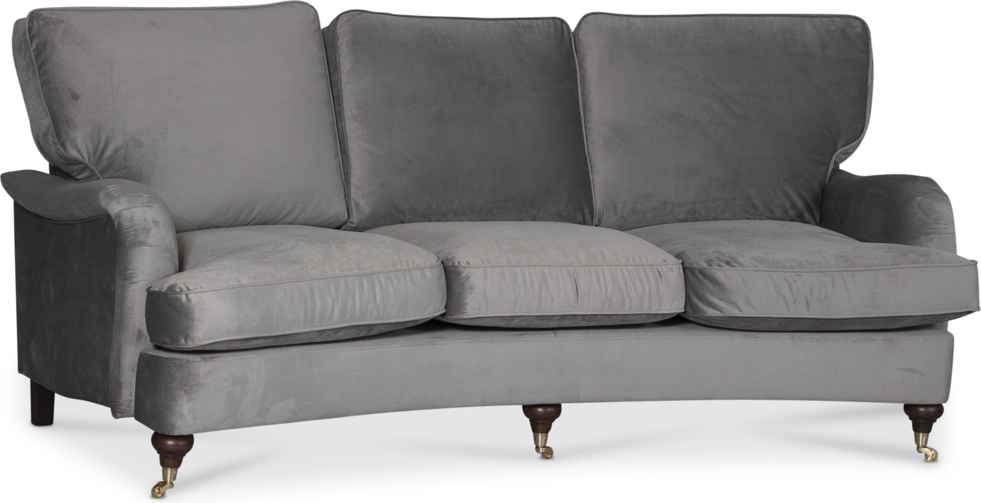 Denna svängda 3 sits soffa är en elegant och tidlös möbel i klassisk Howard-design. Klädd i mjuk grå sammet ger soffan ett lyxigt och sofistikerat uttryck som passar perfekt i både moderna och traditionella vardagsrum. Den svänga formen ger en harmonisk och inbjudande känsla.