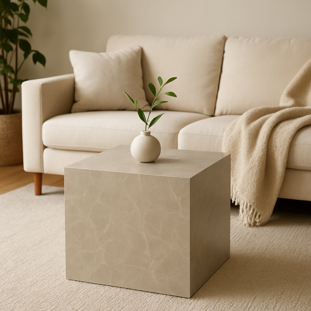 Detta stilrena soffbord kombinerar modern design med en tidlös elegans. Tillverkat i MDF med en yta av marmorfolie, ger bordet ett sobert och exklusivt intryck som passar i de flesta inredningsstilar. Med sina kompakta mått på 60 x 60 x 60 cm fungerar det lika bra som ett praktiskt sidobord, vilket gör det till ett mångsidigt tillskott i ditt vardagsrum eller lounge.