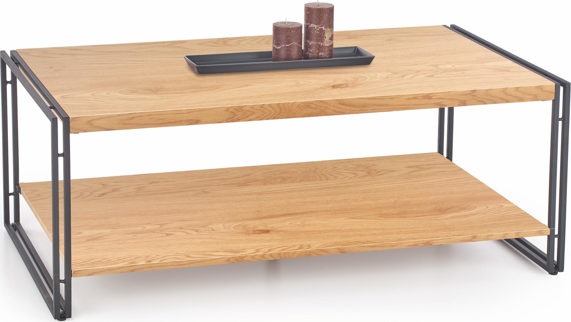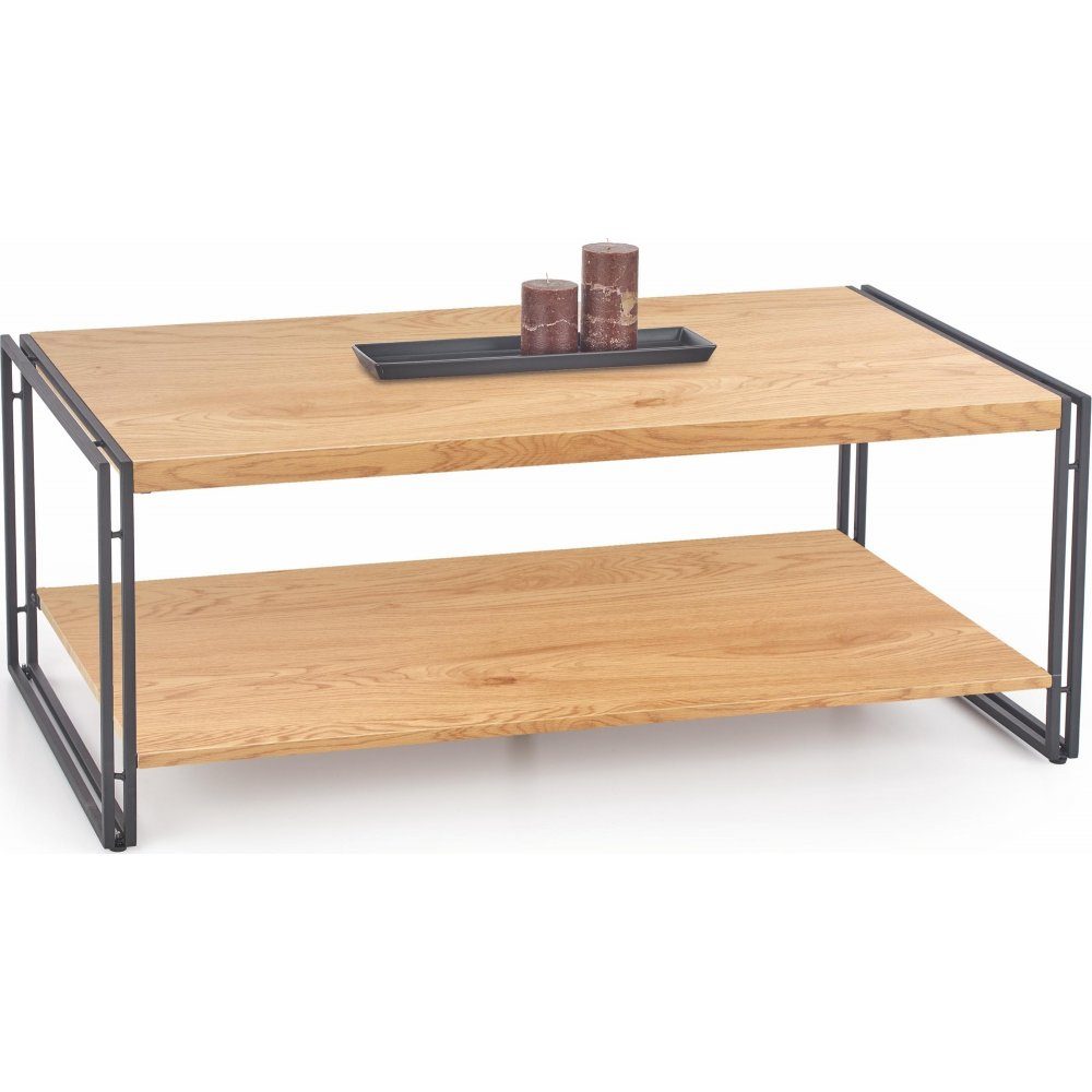 Det här stilrena soffbordet är en perfekt blandning av funktionalitet och modern design. Med en bordsskiva och hylla i träimitation får bordet en varm och inbjudande känsla, medan de svarta metallramarna ger en industriell och robust touch. Den öppna konstruktionen med två nivåer gör det enkelt att organisera och förvara tidningar, böcker eller dekorationer.