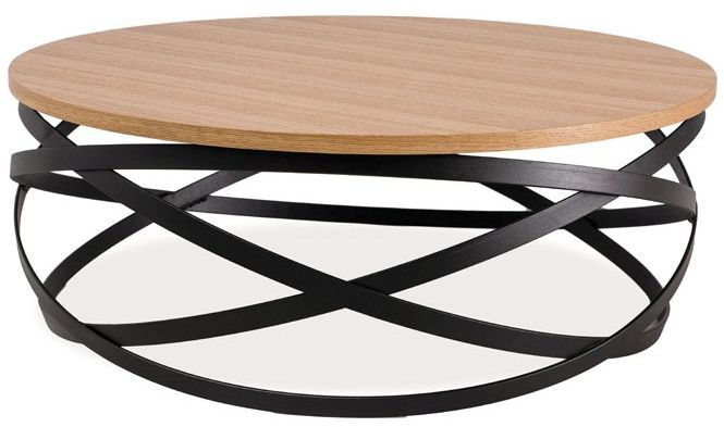 Ett mysigt soffbord med en modern design. Underredet är tillverkat av svart metall och bordsskivan är av MDF med ett härligt ek fanér.