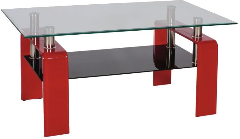 Ett mysigt soffbord med en modern design. Underredet är tillverkat av rött glas med detaljer i kromad metall och bordsskivan är av härdat glas med en praktisk underhylla i svart glas för praktisk förvaring.