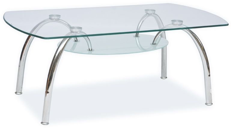 Ett fint soffbord med en modern design. Underredet är tillverkat av kromad metall och bordsskivan samt underhyllan är tillverkade av härdat glas.