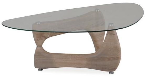 Ett fint soffbord med en modern design. Underredet är tillverkat av MDF med ett härligt ek utförande och med detaljer i kromad metall. Bordsskivan är av härdat glas.