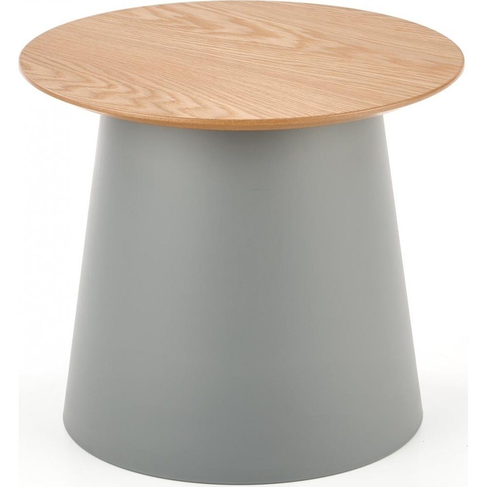 Det här stilrena soffbordet kombinerar enkelhet och modern design. Den runda bordsskivan i naturligt trä ger en varm och inbjudande känsla, medan den grå, konformade basen i metall skapar en minimalistisk och stabil konstruktion. Bordets kompakta och eleganta design gör det perfekt för mindre vardagsrum eller som ett sidobord.