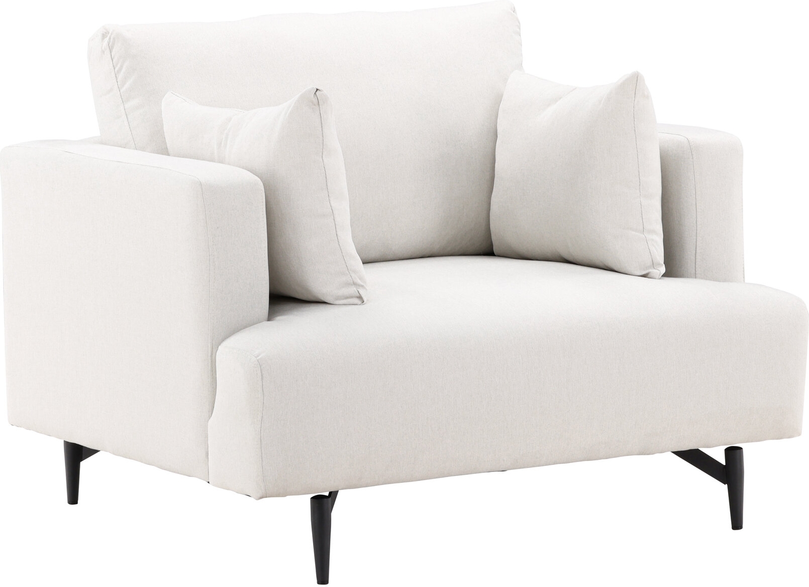 Låt modern design möta tidlösa former med den här trendiga linnefåtöljen i beige färg från serien Sofia! Klädd i ljust, beige polyester- och linnetyg som ger fåtöljen en somrig och trendig look till vardagsrummet. De raka men samtidigt mjuka formerna, de smala höga benen och det generösa sittdjupet skapar en luftig och inbjudande atmosfär. Fåtöljen byggs upp av kuddar i samma klädsel som fåtöljen, vilket ger ett mysigt intryck och benen är snygga i svart metall. En otroligt genomtänkt helhetsdesign helt enkelt med klädd baksida som möjliggör att placera fåtöljen mitt i rummet. Möblera ensam som stilikon eller i grupp tillsammans med en matchande soffgrupp!