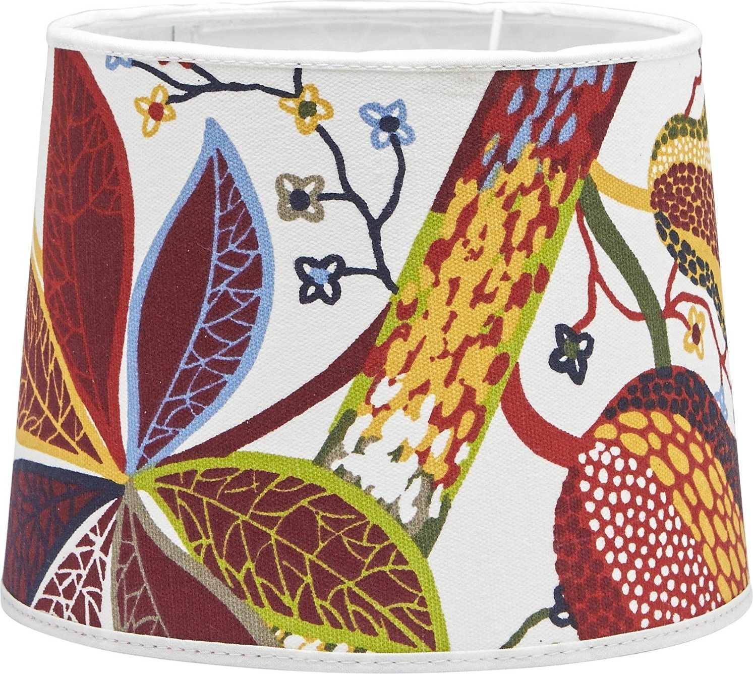 Lampskärm Sofia i ett underbart mönstrat bomullstyg. Lampskärmen har en ljus insida och ger ett behagligt sken och är lätt att matcha med olika lampfötter. Lampskärmen har ett E27 ringfäste.