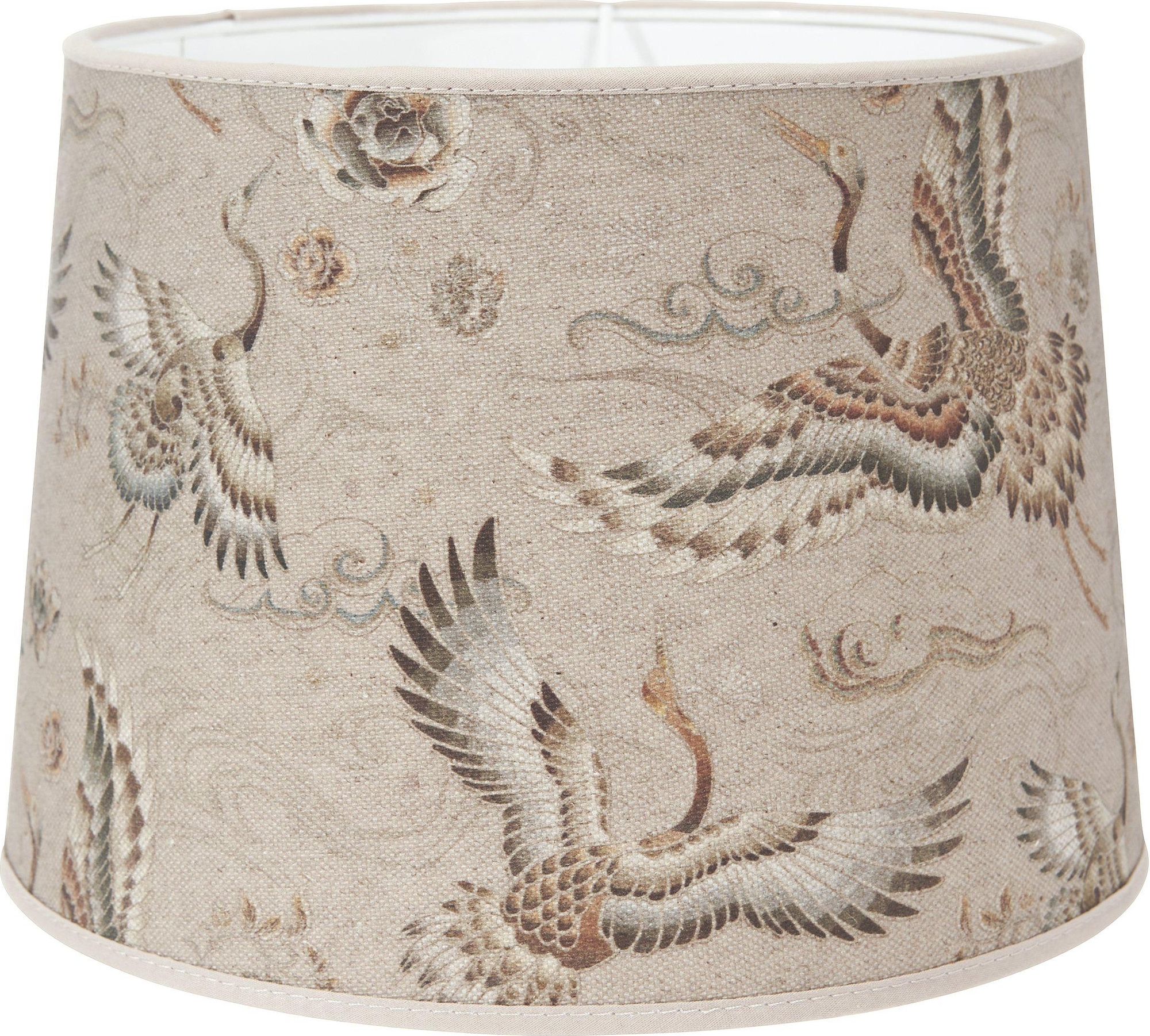 Sofia Lampskärm i ett mönstrat tyg med linnelook. Tyget har en beige botten med tryckta hägrar i lugna toner. Skärmen har beige kantband och en ljus insida som gör att ljuset flödar fint i hela skärmen. Formen är lätt utställd. Tyget är certifierat enligt STANDARD 100 by OEKO-TEX®