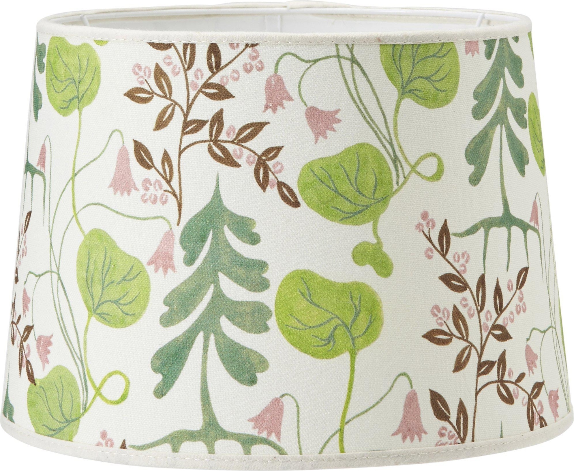 Vår klassiska lampskärm Sofia med vårt unika vårigt tyg Linnea i bomull från Joy Zandén. Lampskärmen har ljus insida och levereras med E27 ringfäste.