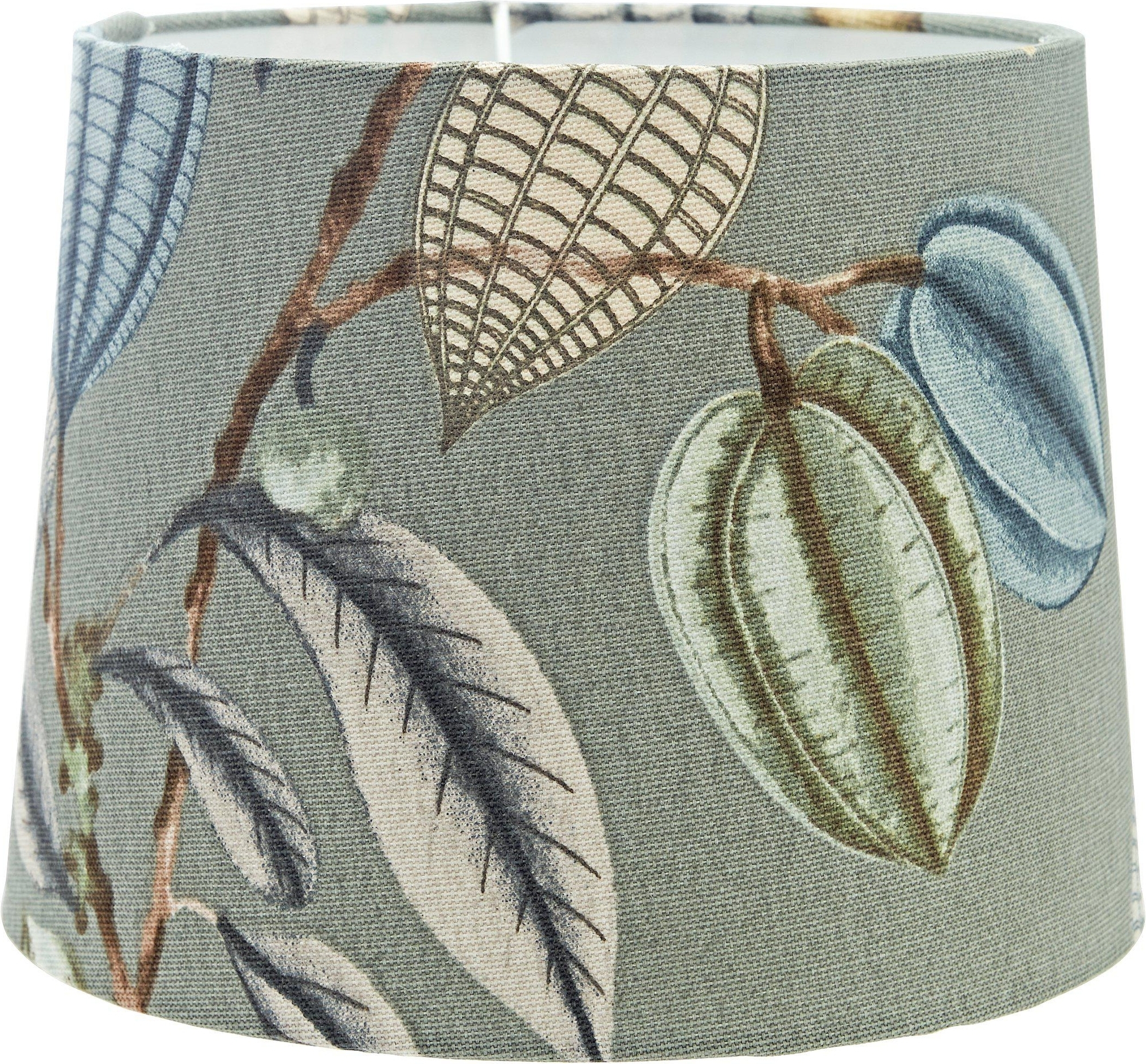 Sofia lampskärm i ett mönstrat bomullstyg. Skärmen har ett tryckt mönster med bladverk och har en ljus insida som gör att ljuset flödar fint. Formen är lätt utställd.