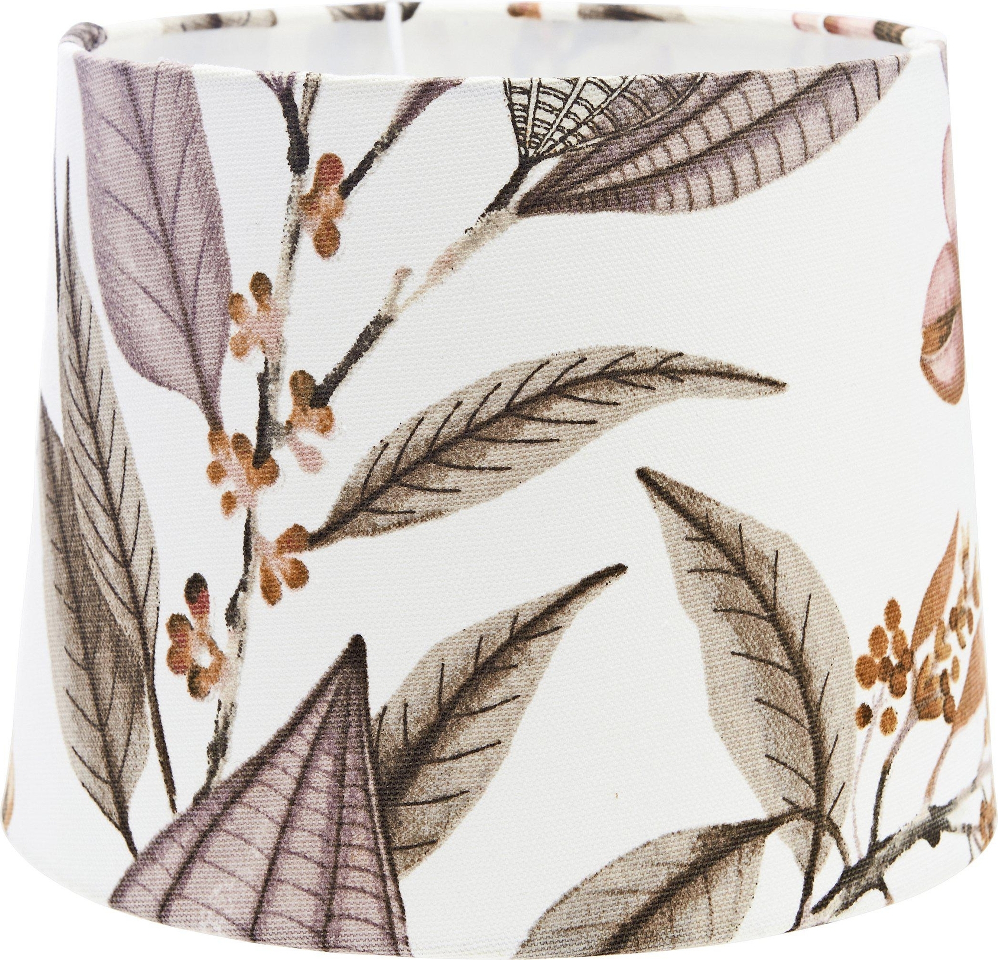 Sofia lampskärm i ett mönstrat bomullstyg. Skärmen har ett tryckt mönster med bladverk och har en ljus insida som gör att ljuset flödar fint. Formen är lätt utställd.