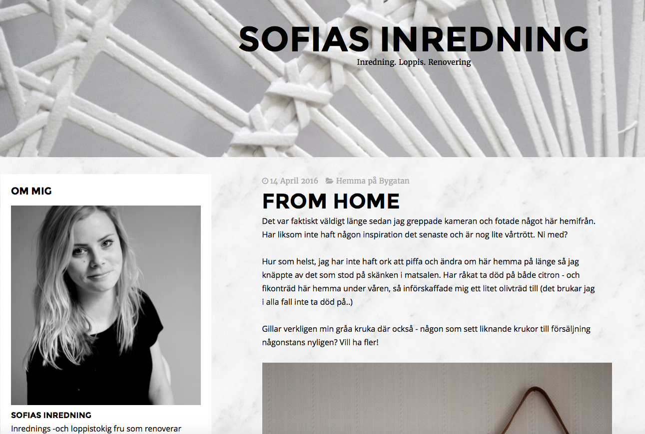 Sofias Inredning drivs av en tjej som har eget företag inom inredning, arbetar i färgaffär, renoverar 20-talshuset de bor i och förstås bloggar, många järn i elden alltså. Sofia har haft sin blogg i många år och det är roligt att se vad som har fått stanna och vad som lämnat inredningen från lägenhet till hus. Grå är en färg som ständigt återkommer men i olika strukturer som en tapet med grå inslag, en matt grå vägg eller en skänk målad i halvmatt grå visst finns det vita inslag men det här är inget vitt hem. Bloggen bjuder också på DIY, loppisfynd som får fin omvårdnad inte sällan med pensel och färg förstås. Sofia delar också med sig av inredningsbilder, lyx eller budget inslag och stilrent pyssel, allt med samma känsla för stil.