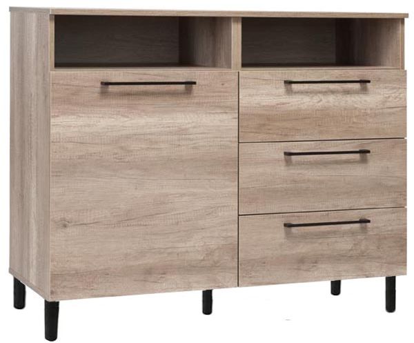Snygg skänk med modern design. Passar perfekt in i flera rum i hushållet, med dem olika färgvalen kan du själv anpassa möblen efter ditt hem och smak. Många alternativ i form av förvaring, med två öppna hyllplan precis under toppskivan, där är även tre smarta lådor och ett skåp med hyllor för praktisk förvaring.