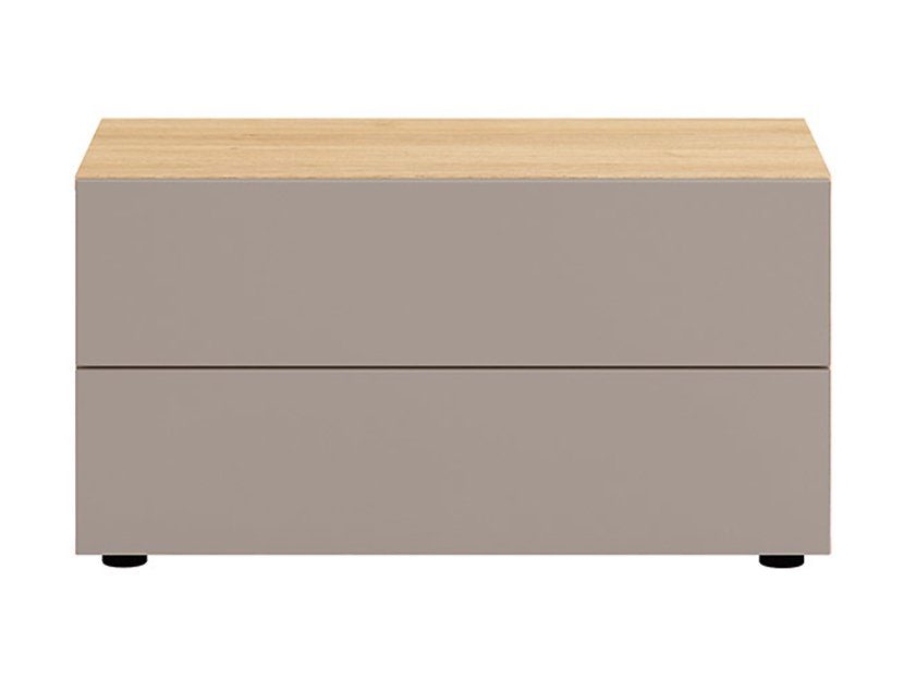Nätt mediabänk i ekimitation med grå fronter på de två lådorna.