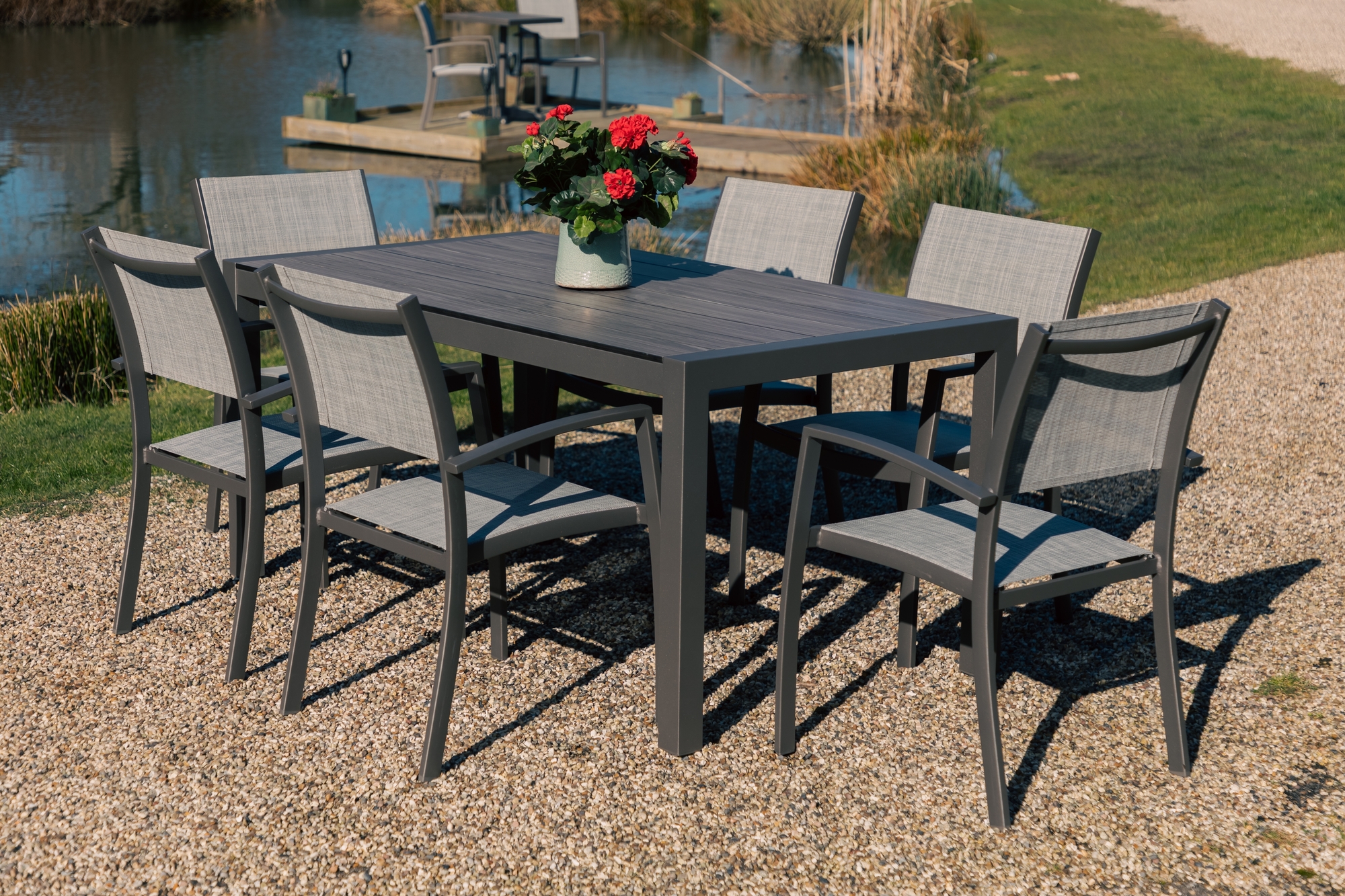 Matgrupp med matbord(160x88 cm) och 6 st staplingsbara matstolar.