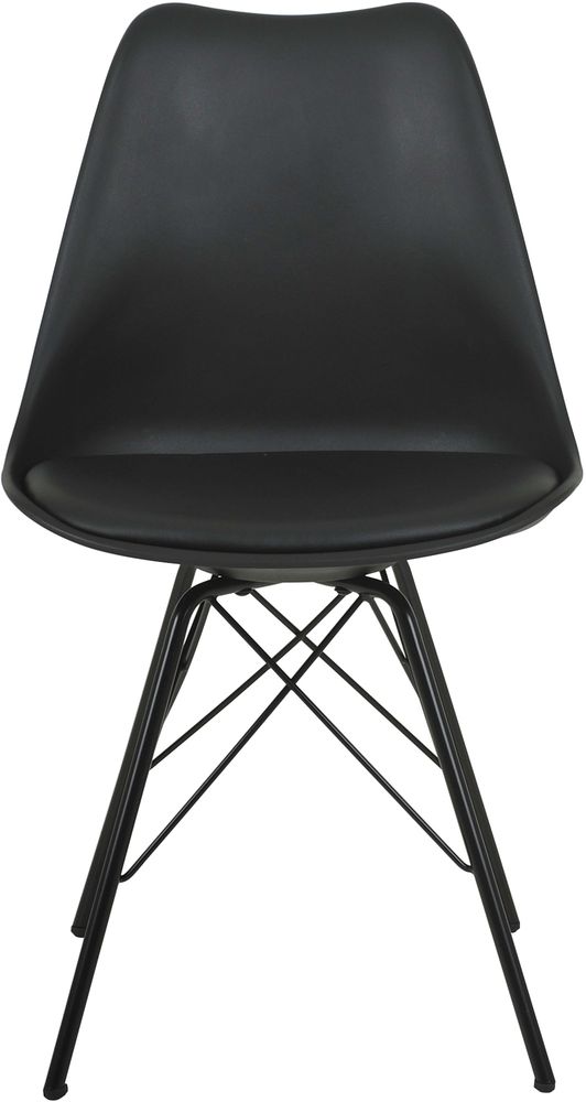 Modern stol i svart PP/PU med ben i svartlackerad metall.