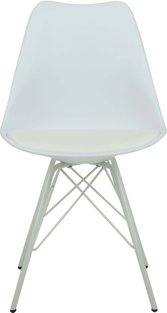 Modern stol i vit PP/PU med ben i vitlackerad metall.