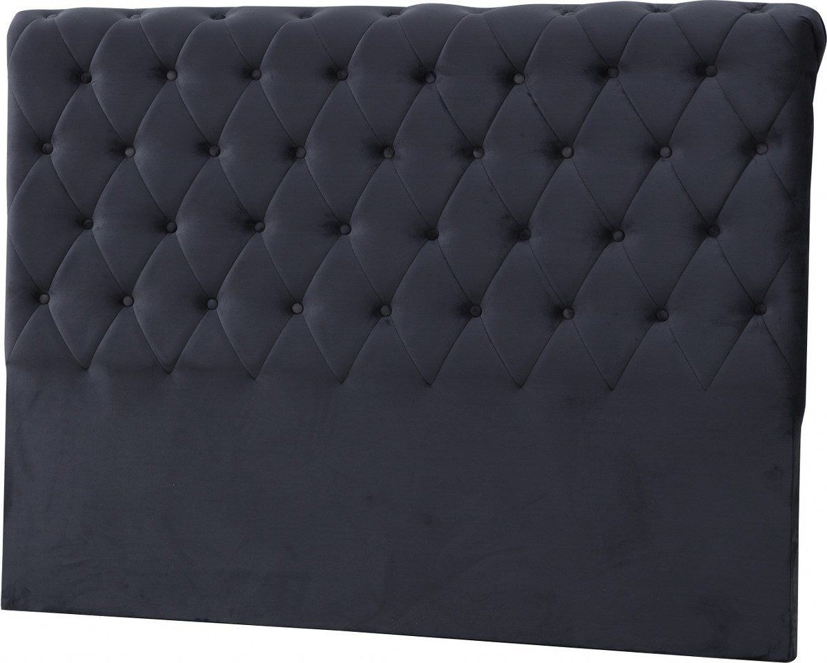 Sänggavel av trä med klädsel av tyg och stoppning av skum.