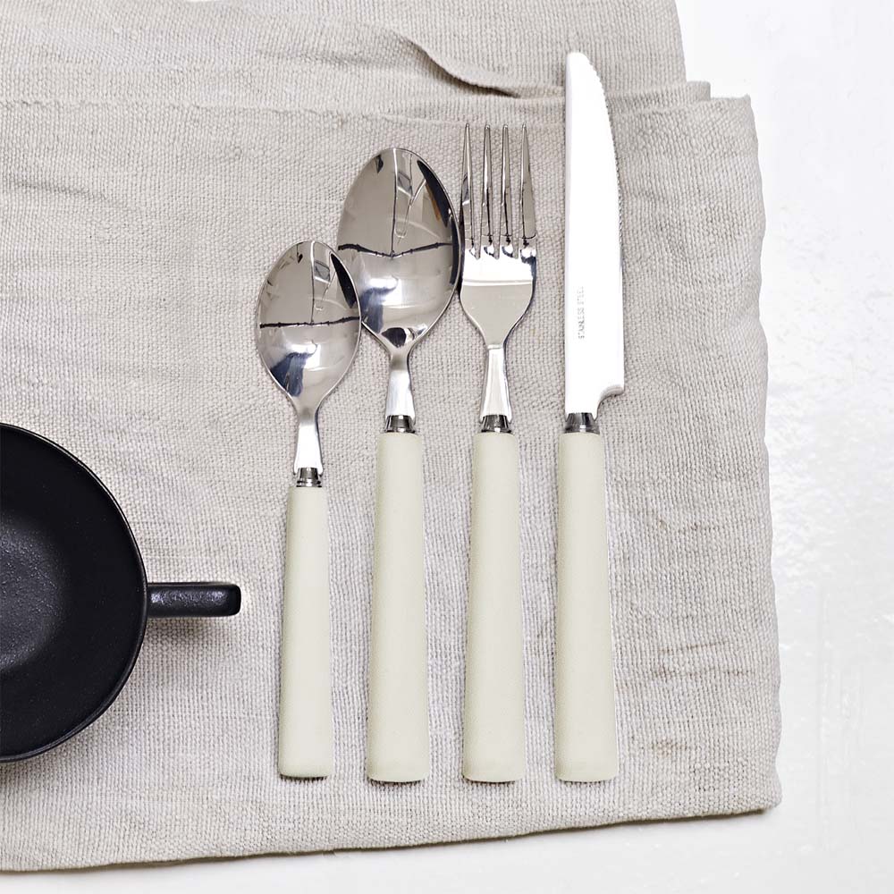 Sonja, från Olsson & Jensen, är ett bestickset med benvita gummihandtag och skaft i polerat rostfritt stål innehållande sex knivar, sex gafflar, sex skedar och sex teskedar. Besticken kan smidigt tvättas i diskmaskin.