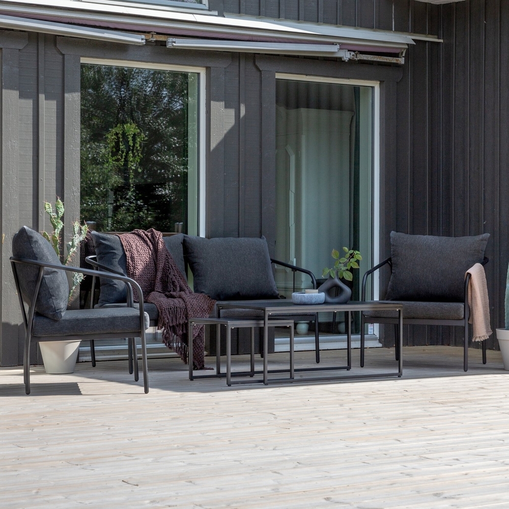 Sopot soffgrupp kombinerar stilren design med hög komfort - skapa den perfekta stämningen på din altan i sommar! Två Sits-soffan och fåtöljerna har raka nordiska former med stomme av svart stål och ett matchande soffbord ingår. Möblera uteplatsen med en inbjudande soffgrupp och få den klockrena loungegruppen. Skötselråd:Stål är ett material som är avvisande mot smuts och vätskor. Däremot behöver man vara uppmärksam på att vatten ska orsaka fläckar och rost. Se därför till att torka av ytan med en en mjuk fuktad trasa och såpvatten, för att undvika att materialet rostar.