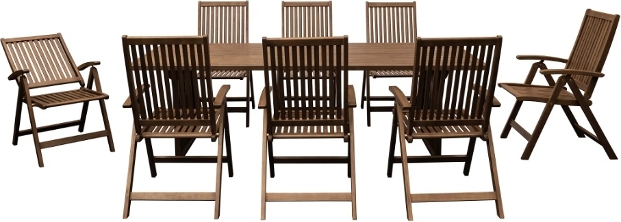 Sotö utegrupp består av ett stort matbord med 8 st fällbara positions stolar i eukalyptus.