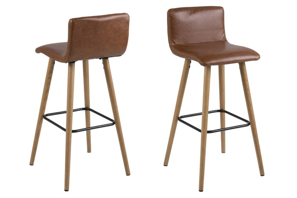 Stilig barstol, klädd med konjak brunt konstläder (PU) med benen är gjorda av oljebehandlad massiv ek och har fotstöd av metall. Stolen ingår i vår Springfield serie.