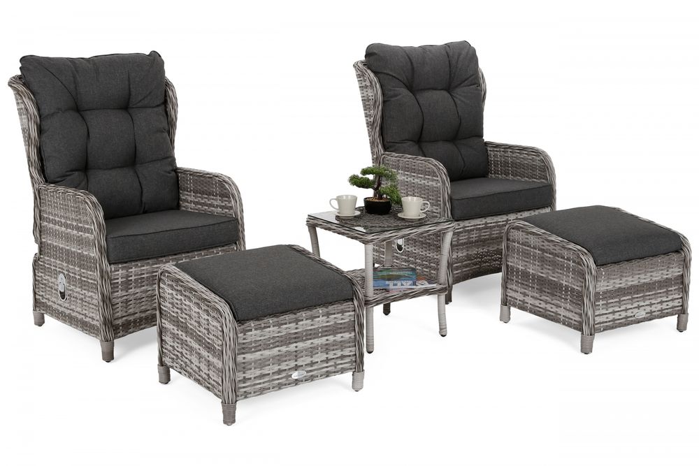 Modern soffgrupp med två ställbara fåtöljer, två fotpallar och ett bord. Allt är tillverkat av pulverlackerad aluminium som är klätt med konstrotting. Bordets toppskiva är tillverkat av 5 mm härdat glas. Sits & ryggdynor ingår.