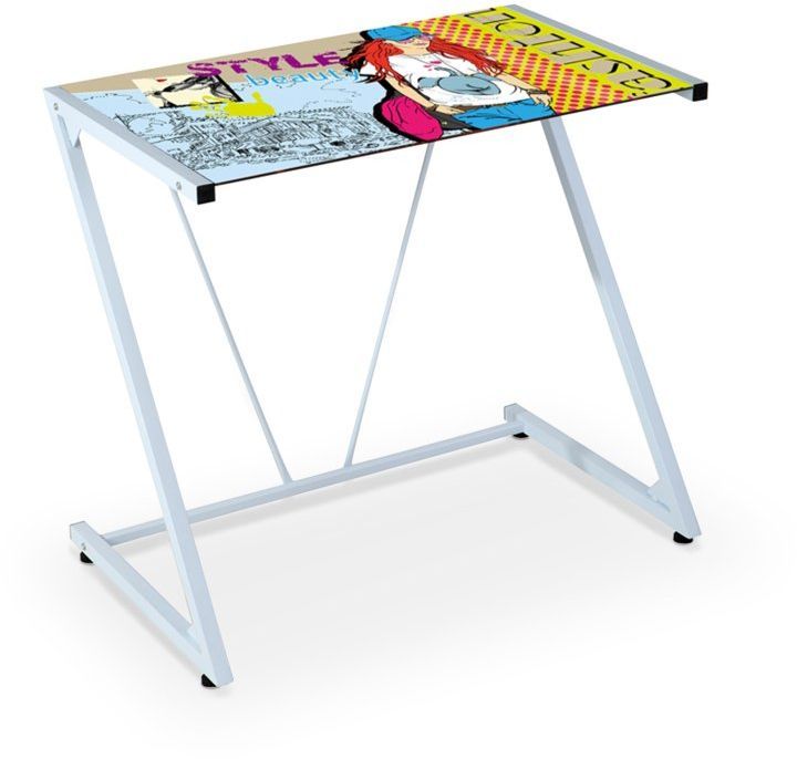 Ett ungdomligt skrivbord med en stilren design. Underredet är tillverkat i vit metall och bordsskivan är av mycket tåligt glas med ett härligt tryck. Bordet passar perfekt in på flera olika platser i hushållet.