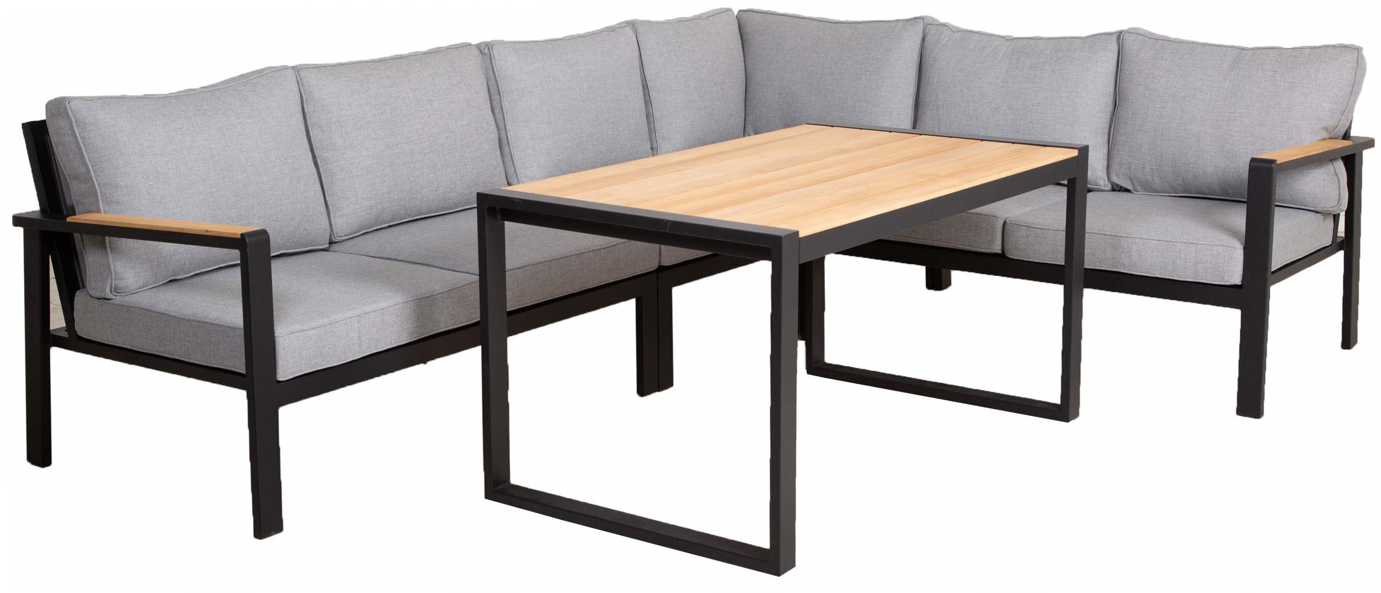 Easy Living By Martinsen, Modern loungegrupp med stomme i svartlackad väderbeständig aluminium med dynor grått slitstarkt tyg. Handtagen i äkta teak skapar en skandinavisk design. Bordet med topp av teakplankor.