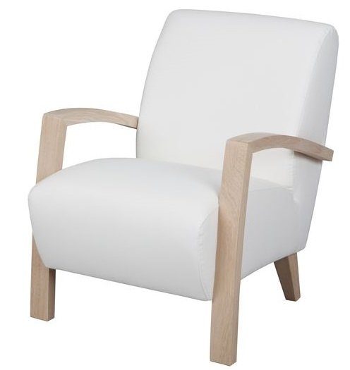 Fåtölj med enkel design. Hög sittdyna och armstöd i trä. Stoppad med kallskum och valbar möbelklädsel.