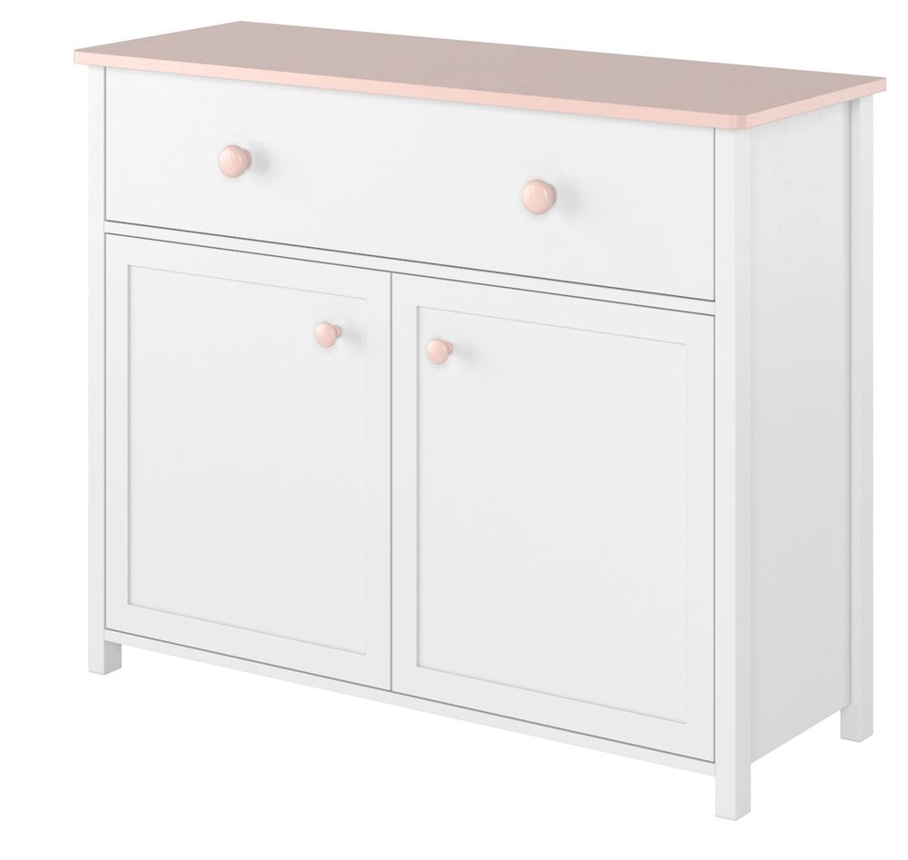 En stilren och klassisk skänk. Tillverkad i MDF med goda förvaringsmöjligheter i form av två skåp och en låda.
