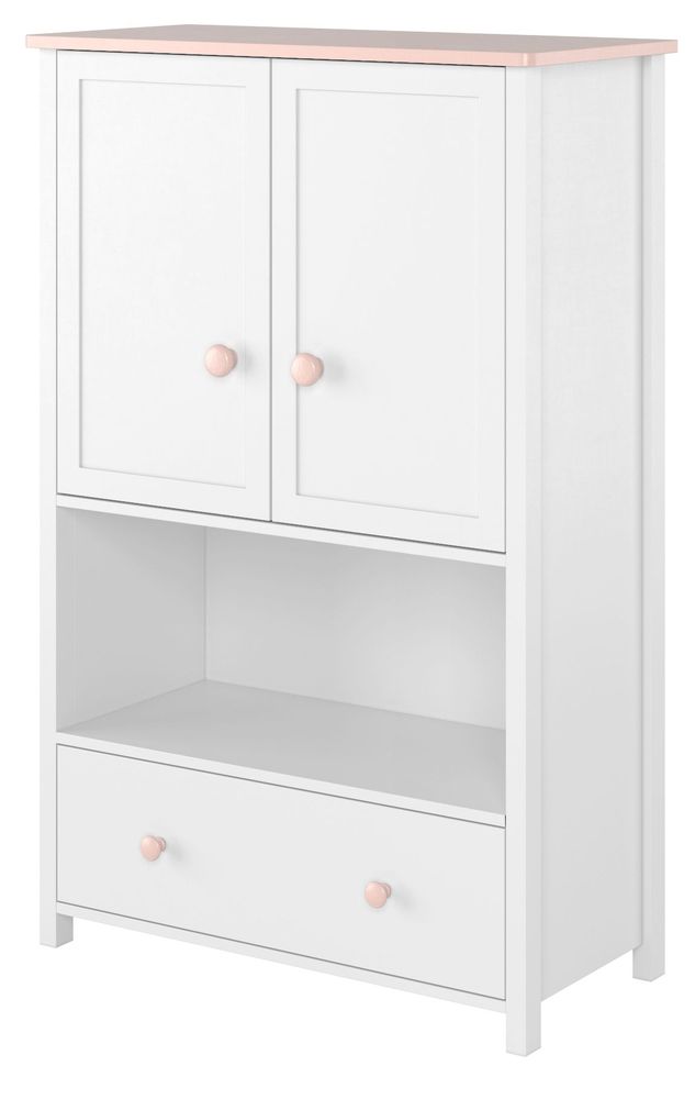 Ett praktiskt förvaringsskåp med en tidlös design. Tillverkat i MDF, med två skåp och en låda, samt ett öppet hyllplan.
