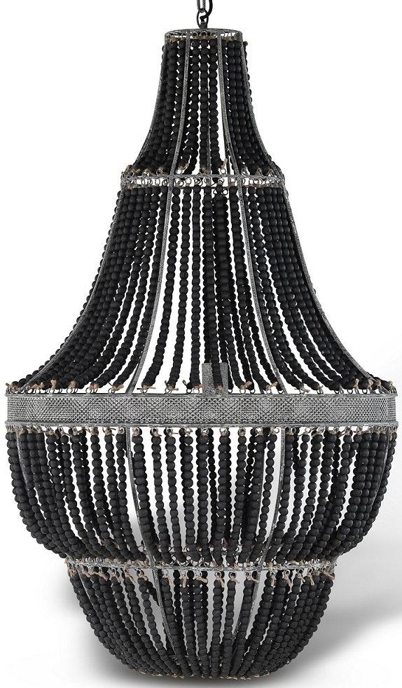Stina Chandelier är en elegant och pampig takkrona med handträdda svarta träkulor som ger en härlig vintagekänsla. Lampan ger en härlig belysning. En stor och maffig takkrona som syns.