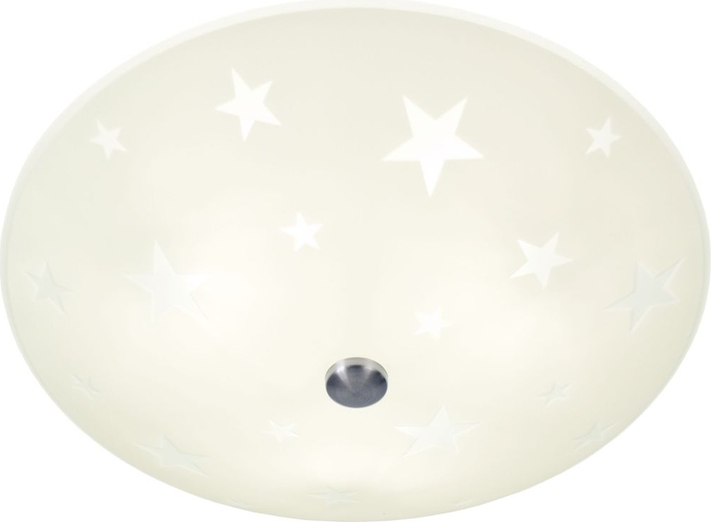 Taklampa i metall och vitt glas med mönster. Monteras lätt i taket.