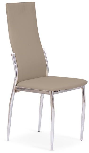 En härlig matstol med en modern design. Underredet är tillverkat i kromad metall och sitsen är klädd med ett mycket behagligt beigt konstläder för maximal komfort.