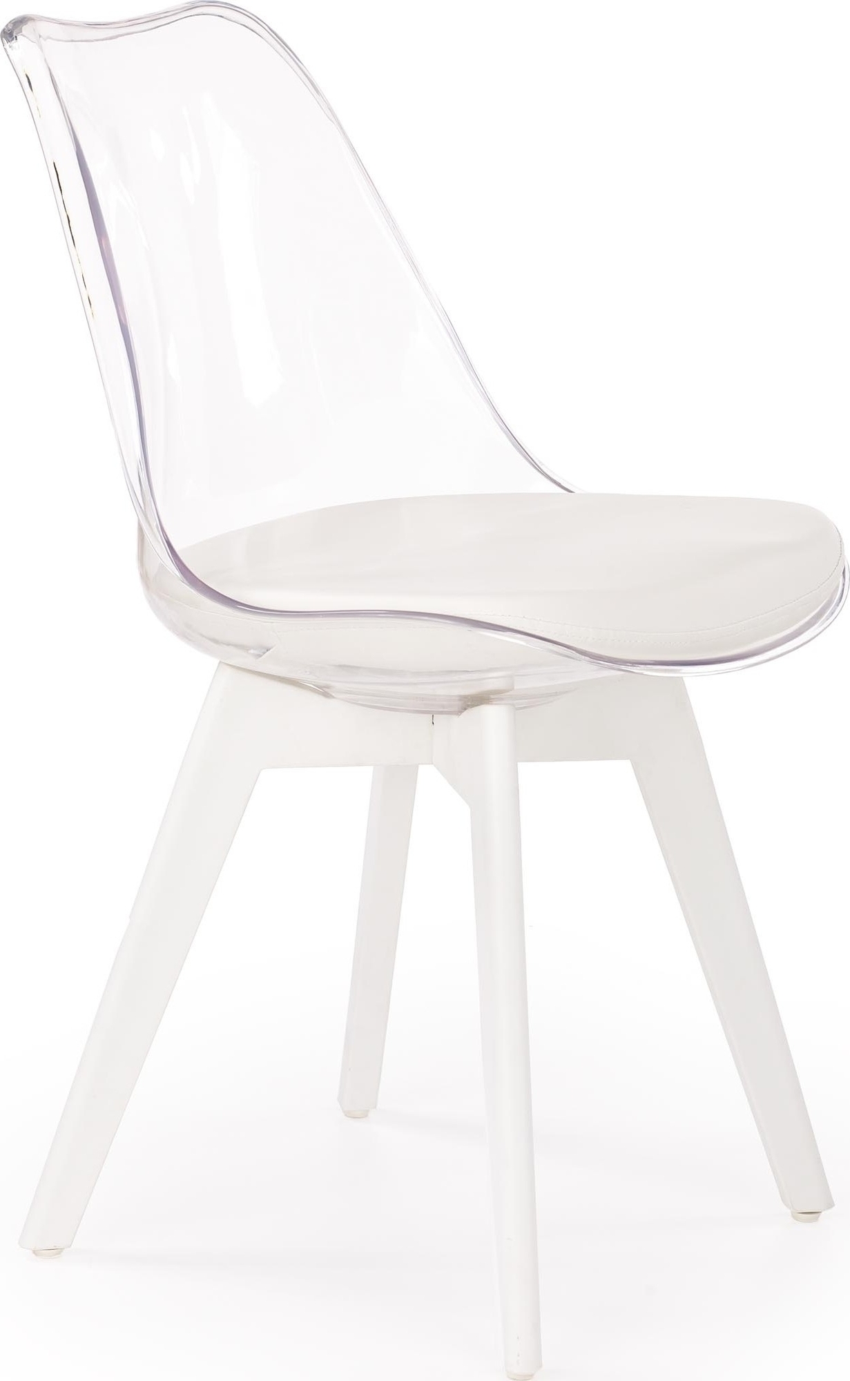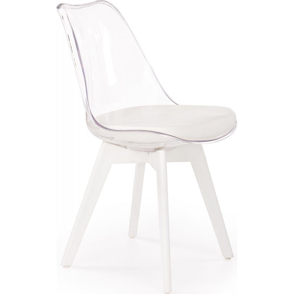 En unik matstol med en modern design. Underredet är tillverkat av vit plast och sitsen är av transparent plast med en mycket behaglig vit sittdyna för maximal komfort.