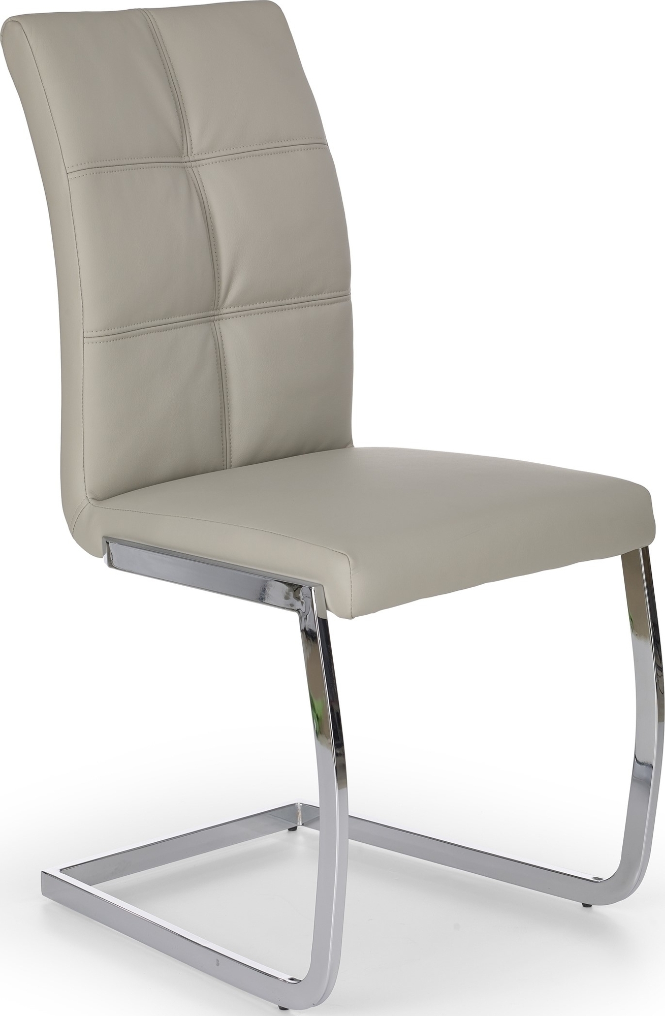 En härlig matstol med en modern design. Underredet är tillverkat i kromad metall och sitsen är klädd med ett mycket behagligt grått konstläder för maximal komfort.