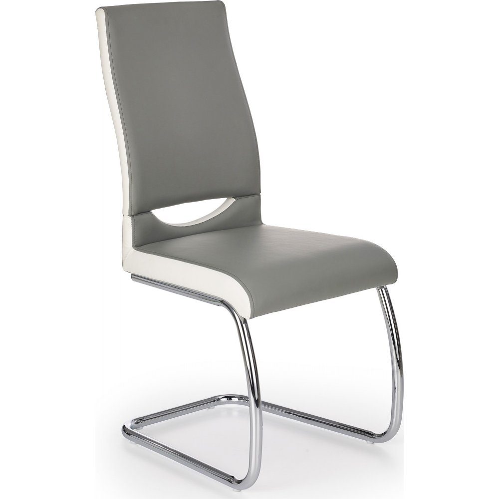 En mysig matstol med en modern design. Underredet är tillverkat i kromad metall och sitsen är klädd med ett mycket behagligt grått konstläder med detaljer i vitt för maximal komfort.
