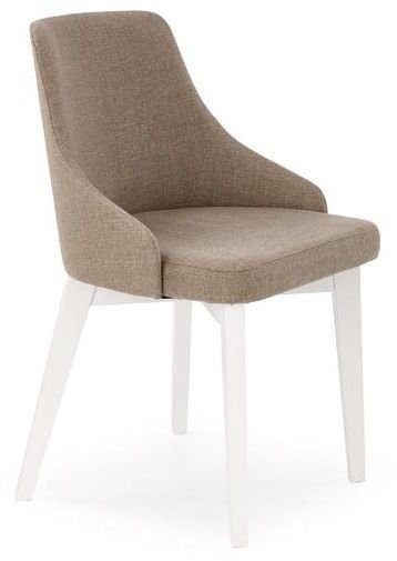 En mysig matstol med en stilren design. Underredet är tillverkat av vitmålad massiv bok och sitsen är klädd med ett mycket behagligt beigt tyg för den maximala komforten.