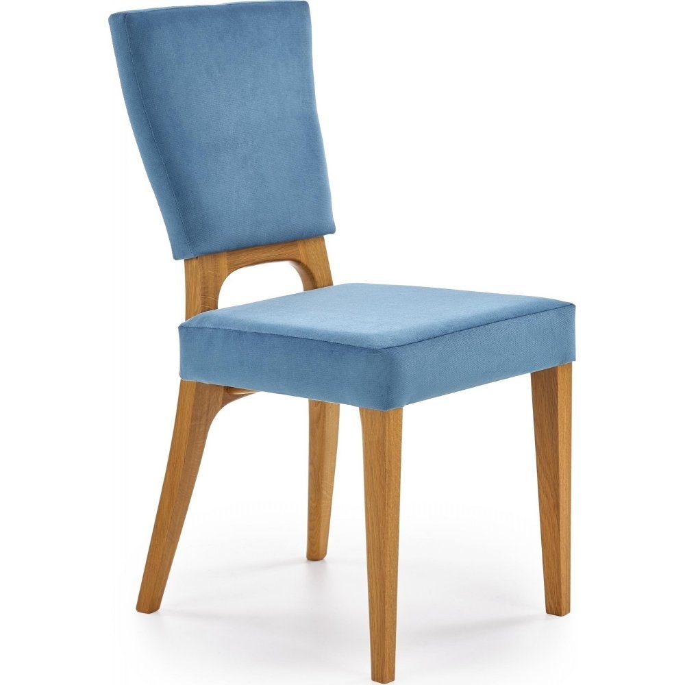 En fin matstol med en tidlös design. Stolen är tillverkad i solid ek och är klädd med ett mycket behagligt blått tyg för maximal komfort.