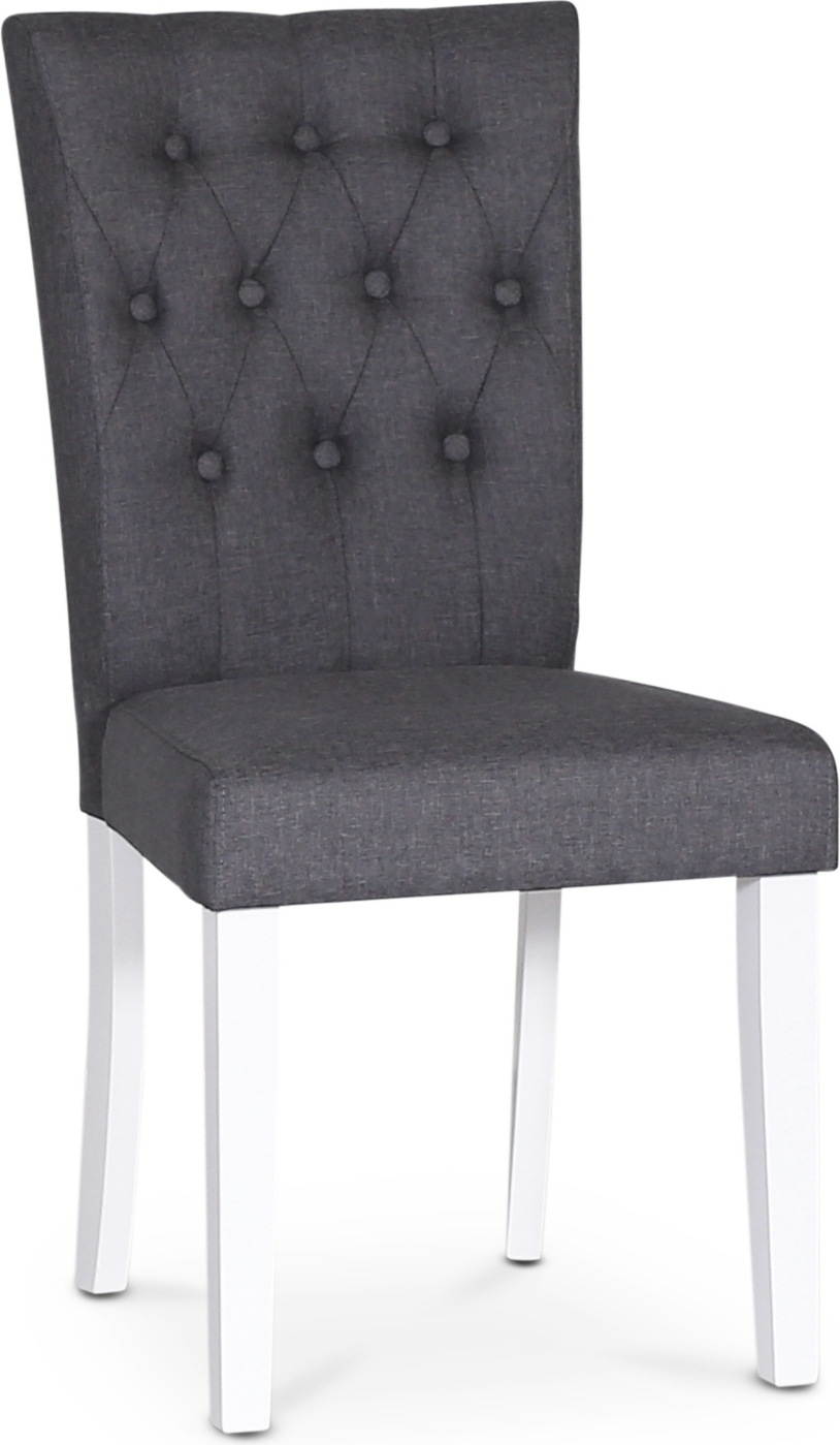 De vitlackade träbenen ger en ljus och fräsch känsla, medan de små knapparna i ryggen fungerar som en elegant detalj som lyfter stolens design.